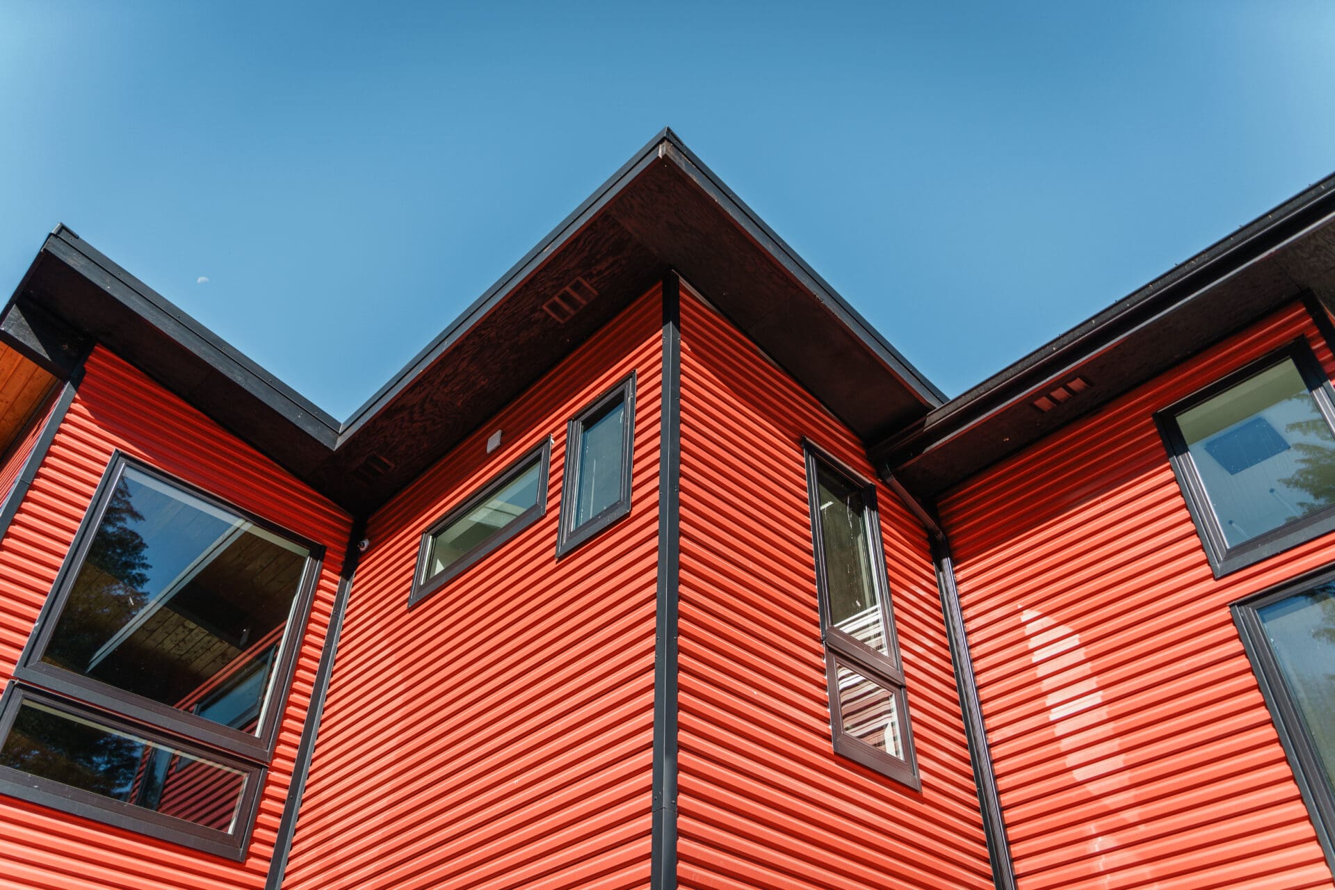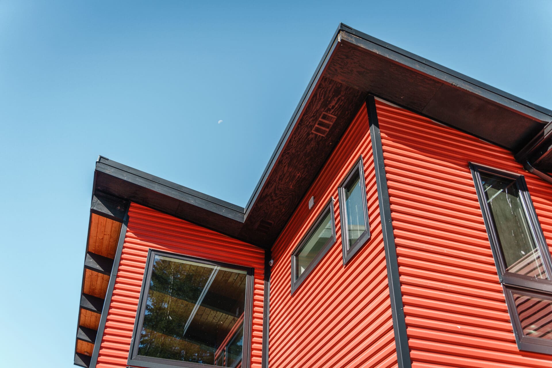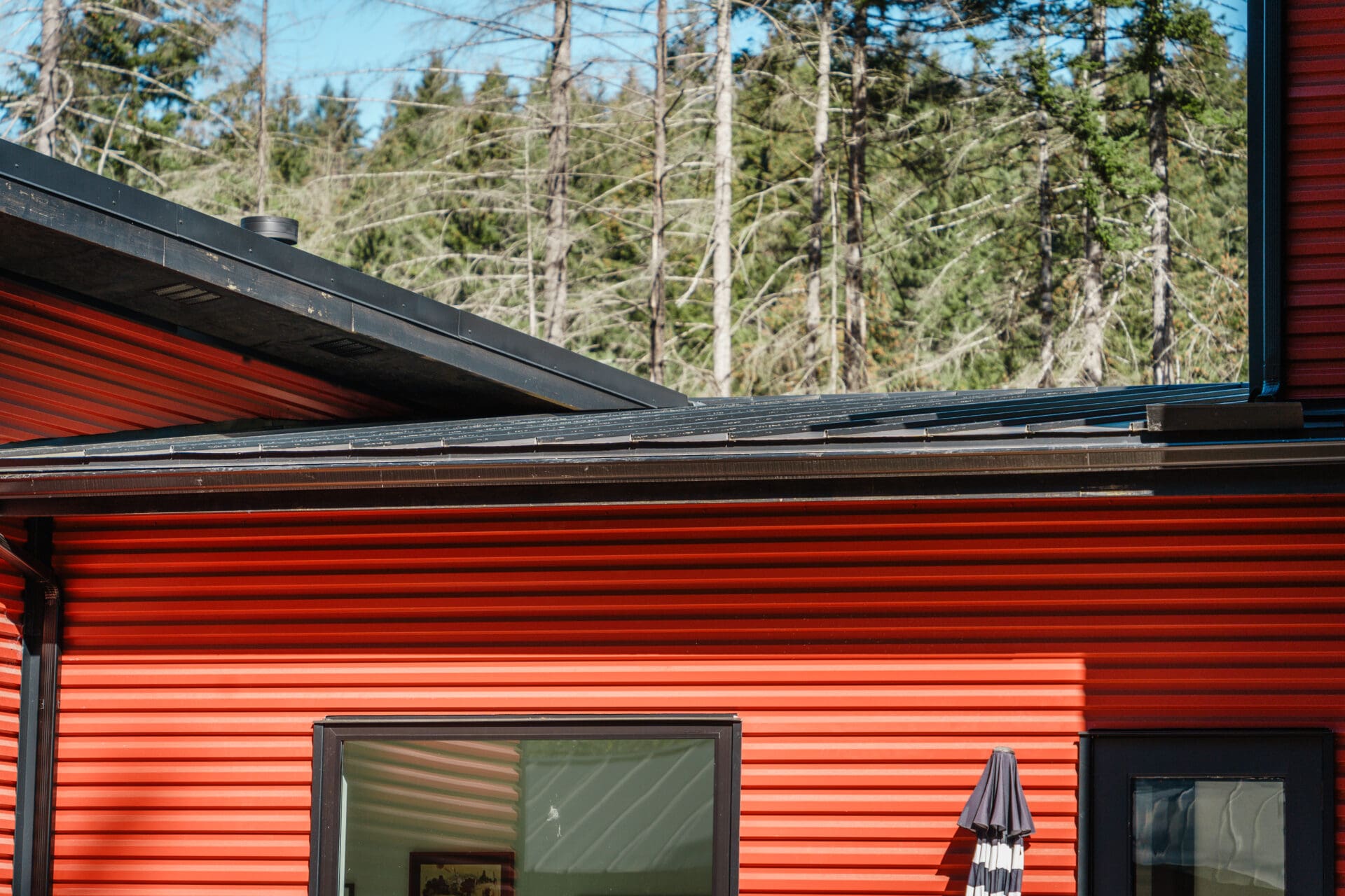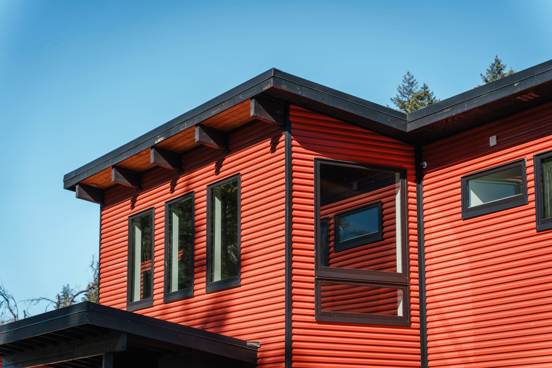 The roof of this home is formed with our Easy-Lock™ panel in the color Matte Black. Easy-Lock™ is a patented no-siphon dry lock standing seam panel that has a reversing feature that allows installation of panels from both directions. The siding on this project is CE-A, from our Contour Express Series in the Retro Red color. Screw flange and Clip attachment options are available for this panel; with this project using the clip system.