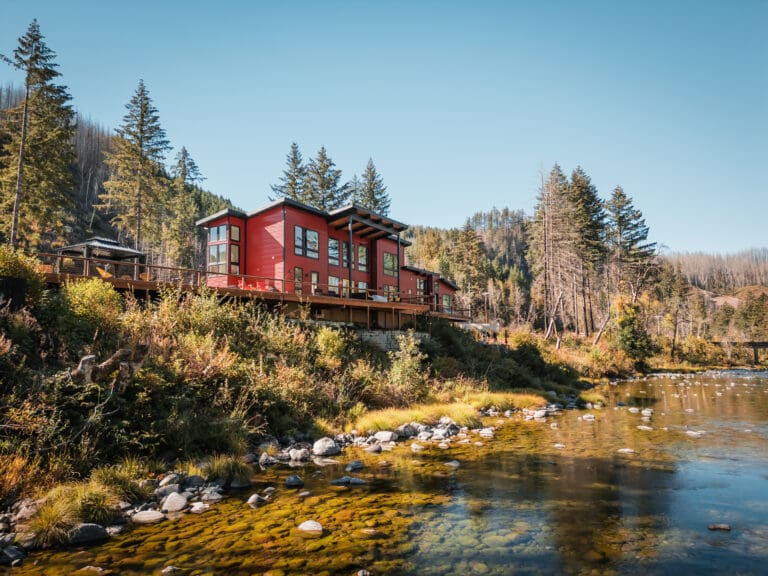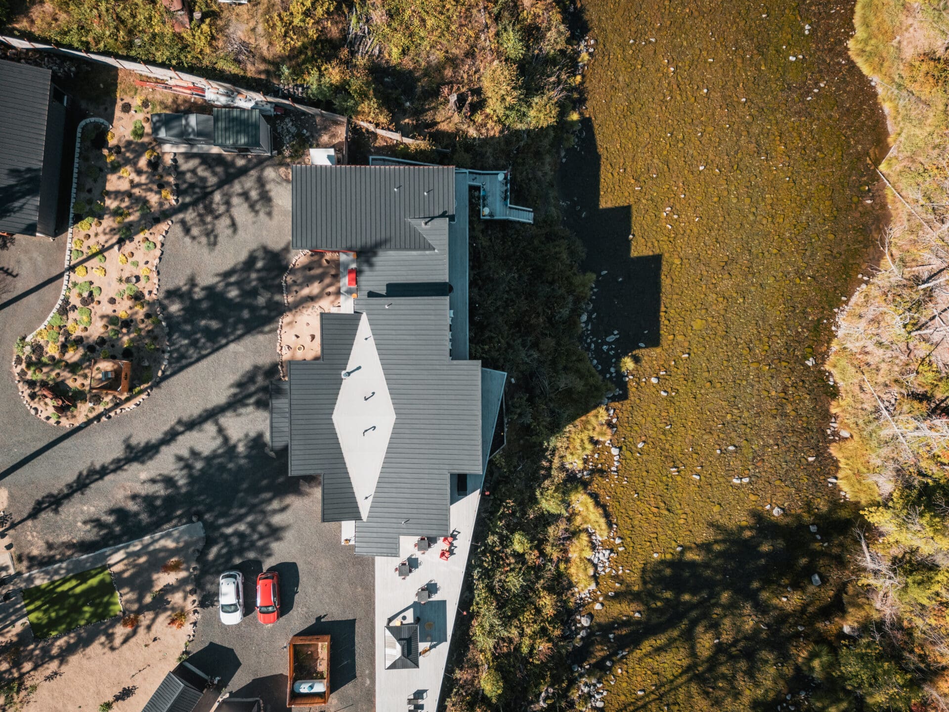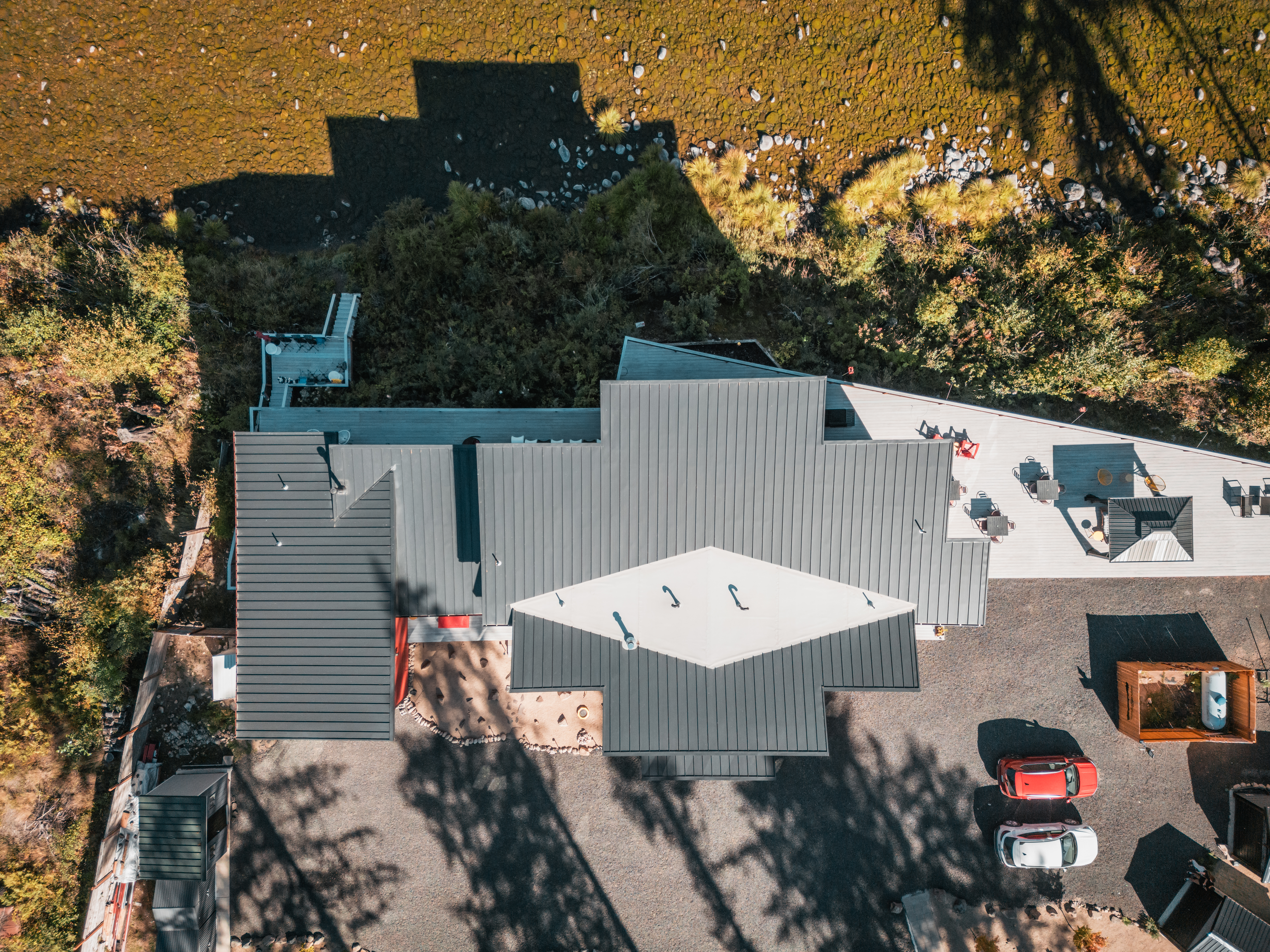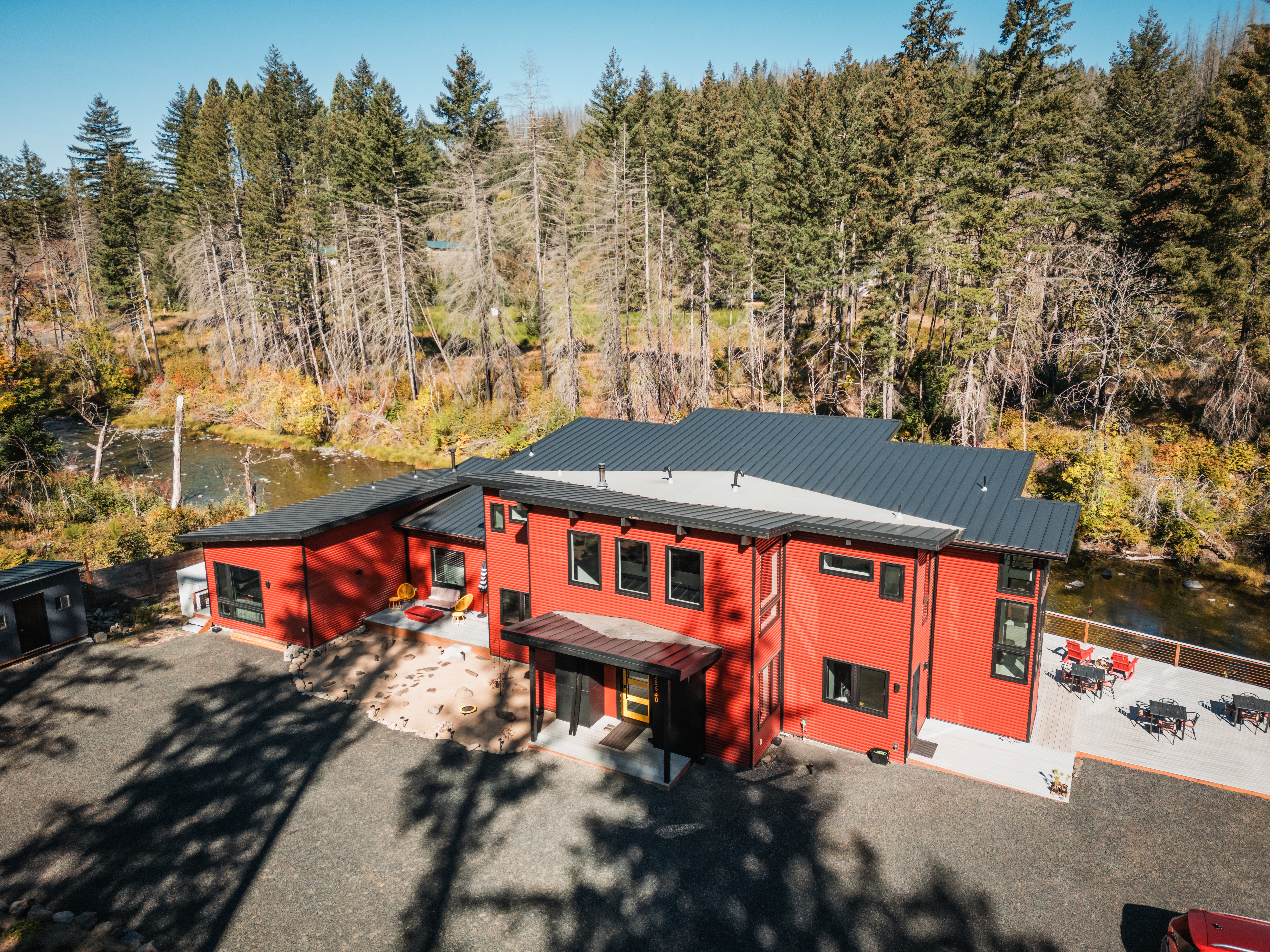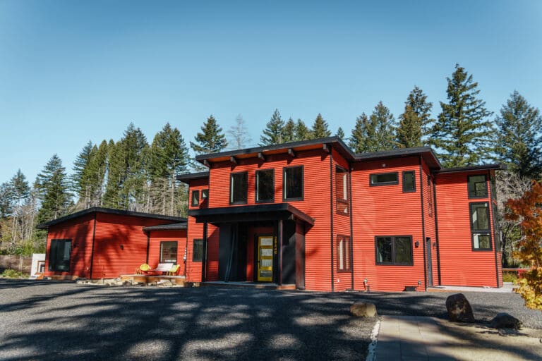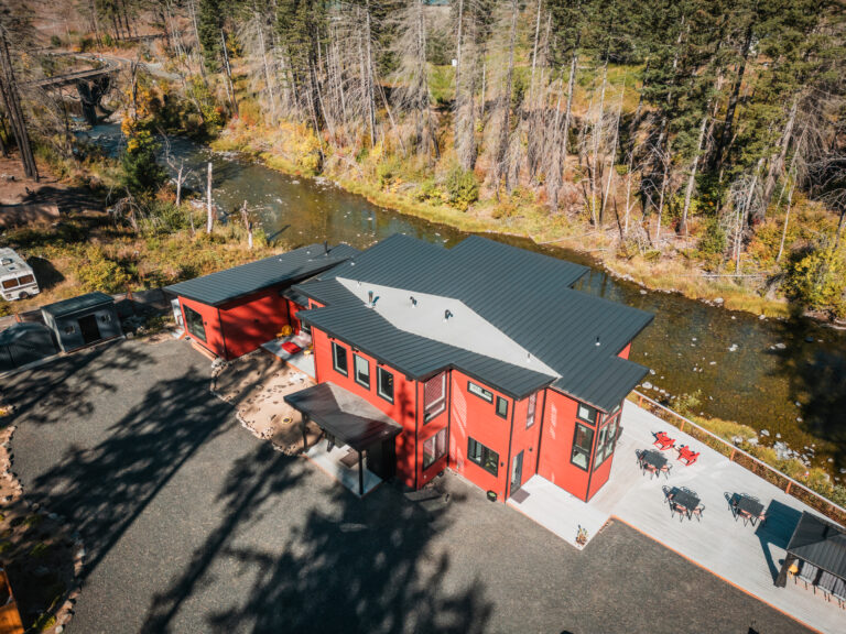 The roof of this home is formed with our Easy-Lock™ panel in the color Matte Black. Easy-Lock™ is a patented no-siphon dry lock standing seam panel that has a reversing feature that allows installation of panels from both directions. The siding on this project is CE-A, from our Contour Express Series in the Retro Red color. Screw flange and Clip attachment options are available for this panel; with this project using the clip system.