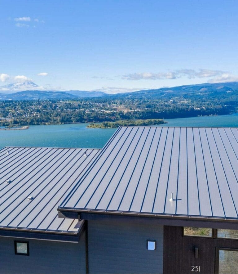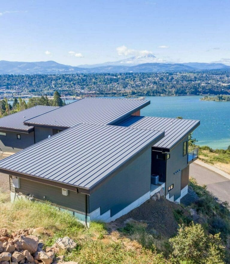 The Hanson Home showcases two of Taylor Metal’s panels! Easy-Lock™ Standing Seam with accent ribs and notching is the panel applied to the roof; the width is 16″, the gauge is 24 and the color is Charcoal Grey (Kynar 500®). The panel installed on the front siding of the home is Contour Series™ C-5 panel, the width is 12″, the gauge is 24 and the color is Black (Kynar 500®). The fascia on the home also features Easy-Lock™ with v-grooves, the gauge is 24, and the color is Black (Kynar 500®).