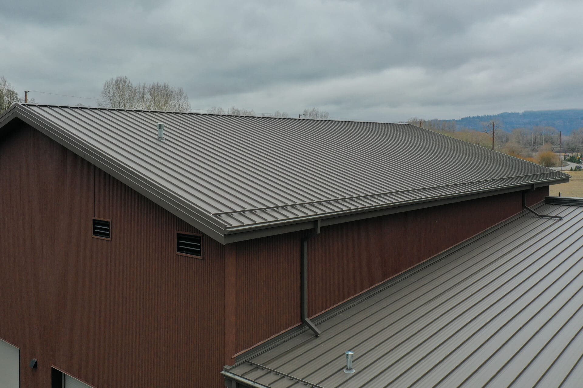 This retail building located in Kalama WA has 16” MS-200™ standing seam panels with striations, clip relief, and sealant installed on the roof along with our S-5 ColorGard 2.0 Snow Guards. The siding features Taylor Metal’s Contour Series™ C-5 and C-8 panel. Contour Series™ can be installed horizontally or vertically, with concealed fastener attachment. Additional siding consists of 22ga Classic 7/8″ Corrugated Panels. These panels are installed with exposed fasteners.