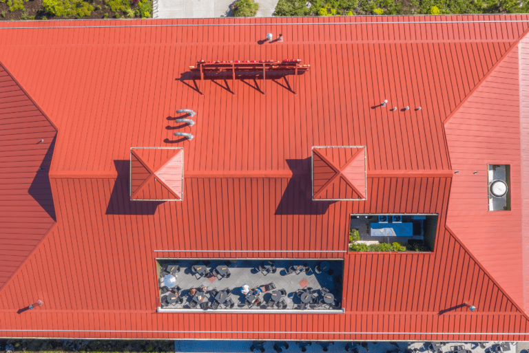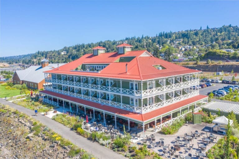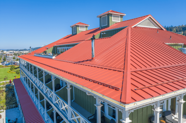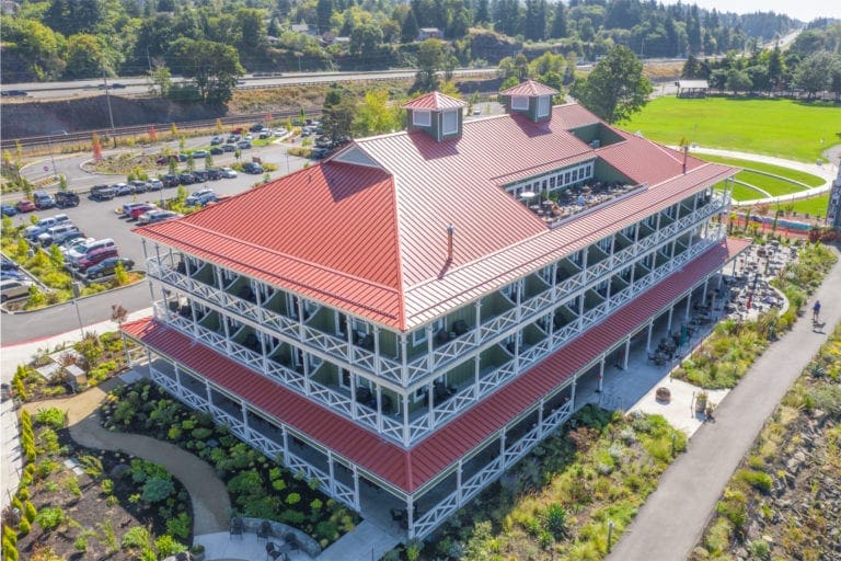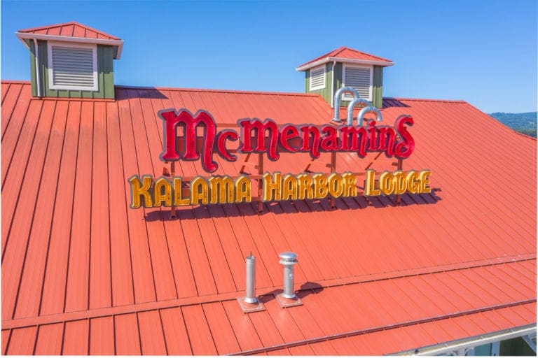 McMenamins Kalama Harbor Lodge’s roof showcases a 24 gauge, 16.625″ width MS-150™ panel with accent ribs, injected sealant, and a custom color (Kynar 500®) finish.
