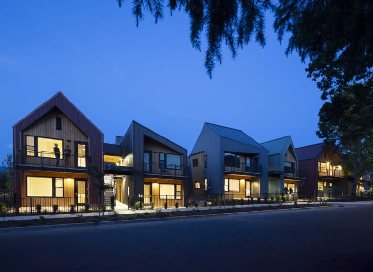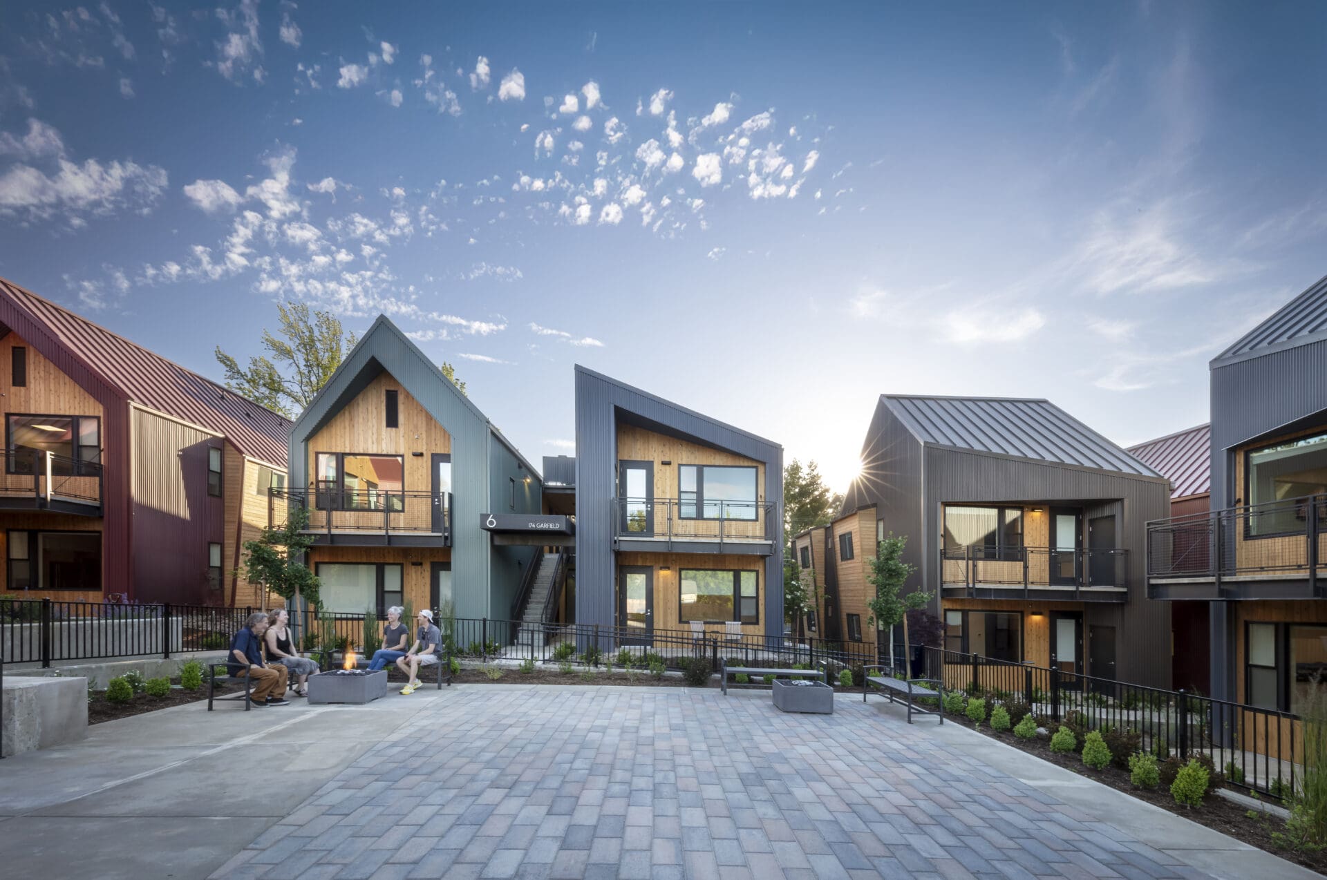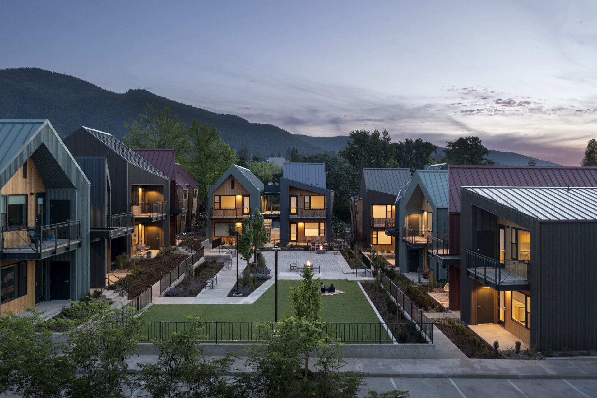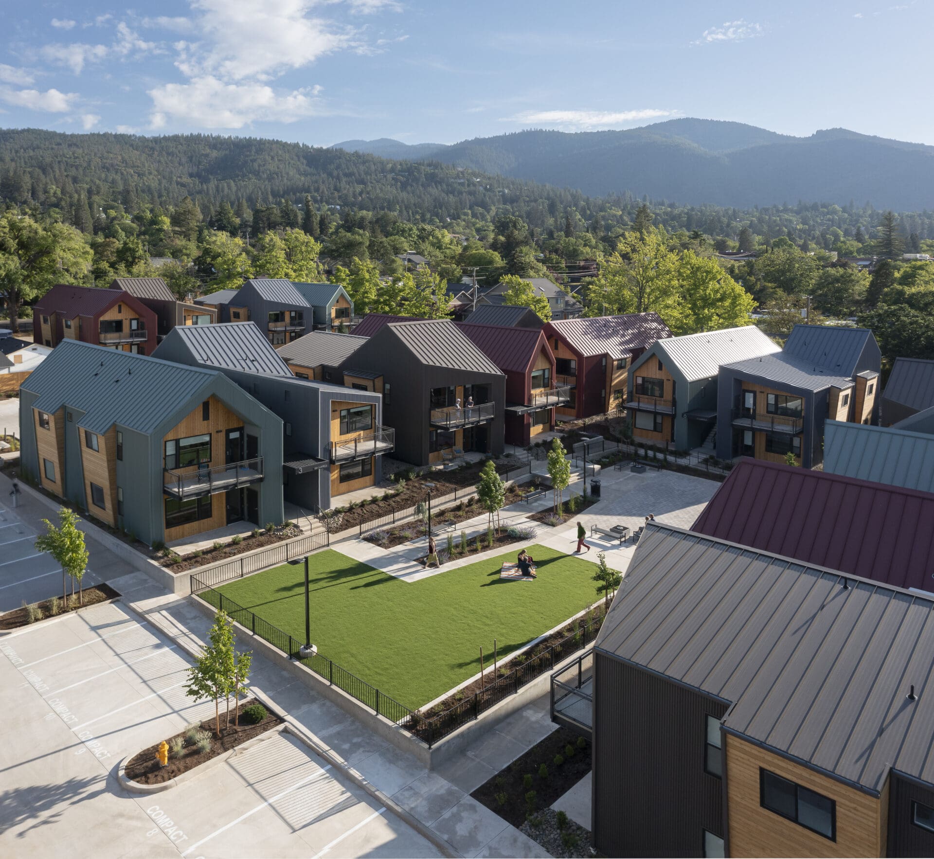 Located in Ashland, OR, the project involves 14 two-story buildings that house 72 studio apartments. They are designed and built around a beautiful community courtyard and living area. Each building has unique architecture, including varying angles and the use of metal siding, metal roofing, and cedar siding.