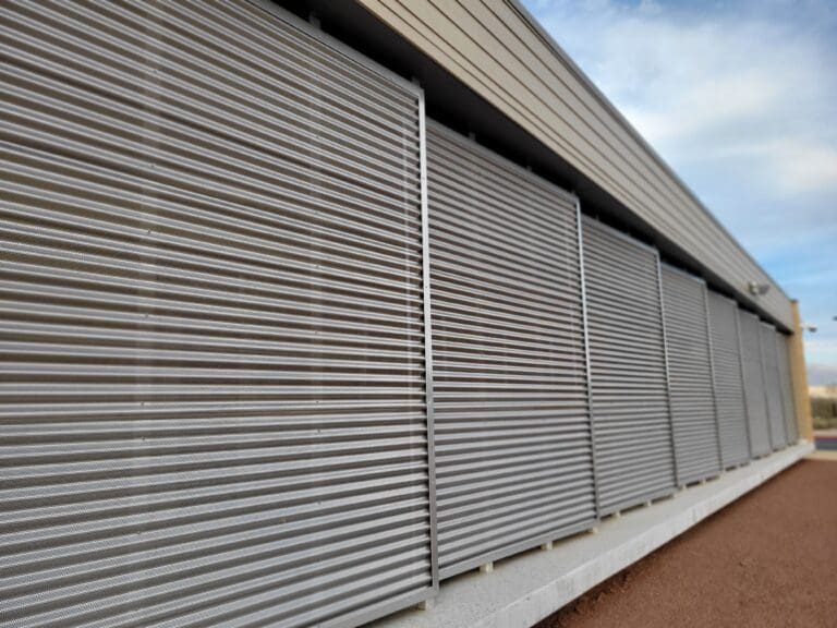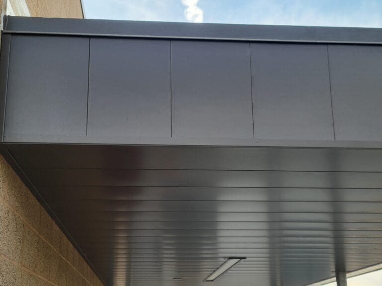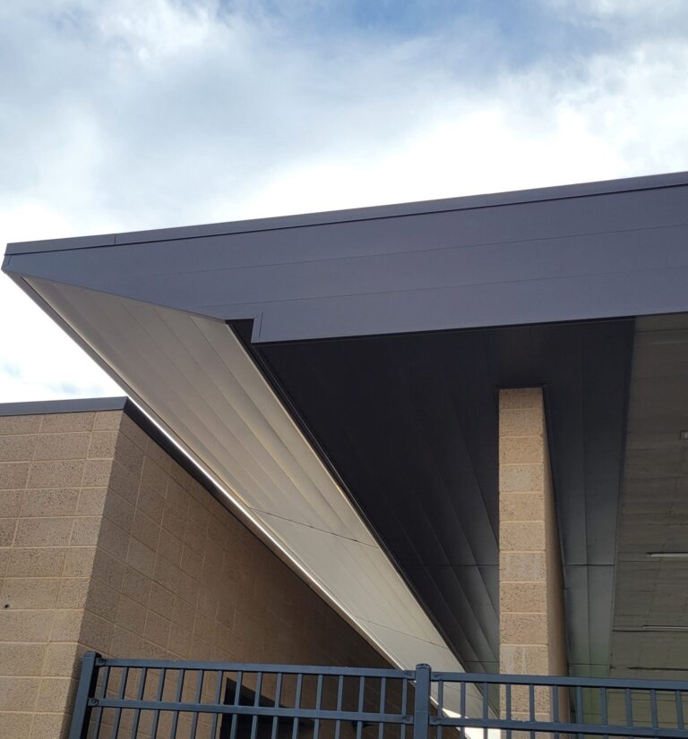 The Northshore Elementary School features Taylor Metal’s SmoothWall™ and Classic 7/8″ Corrugated™ panels. Our SmoothWall™ panel shown, 22 gauge and 12″ coverage, is installed horizontally as a soffit and in the style of flat pan. Then our Classic 7/8″ Corrugated™, 20 gauge and 37-1/3″ coverage, is staggered along a wall and showcases the panel in stainless steel and is fully perforated.