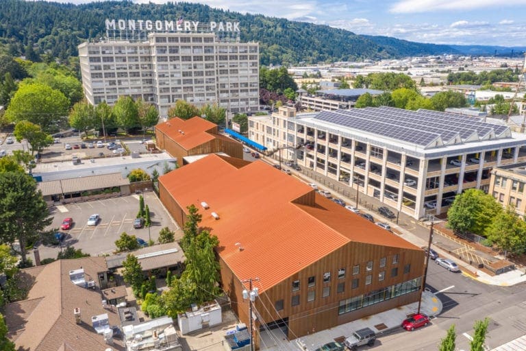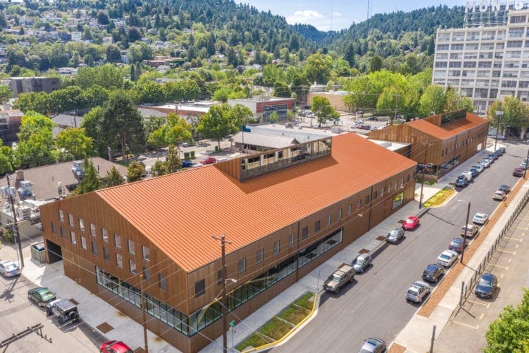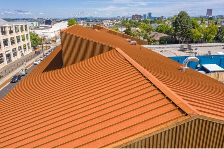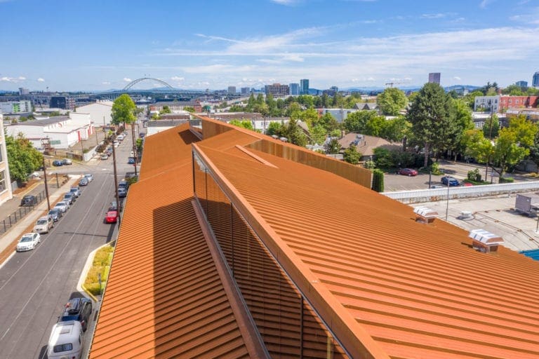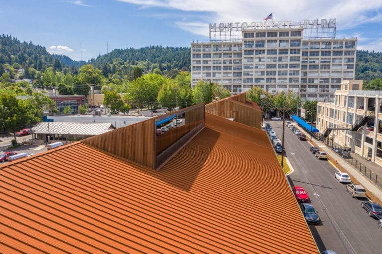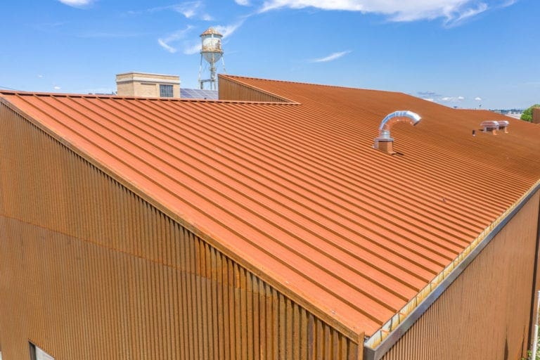 The Redfox Commons’ roof showcases a 22 gauge, 15.5″ width MS200™ panel with a Rusteel Plus™ finish. The panel on the siding is a 22 gauge custom Contour Series™ panel, also with a Rusteel Plus™ finish. Rusteel Plus™is an ideal design option for a classic, historic, and weathered look.