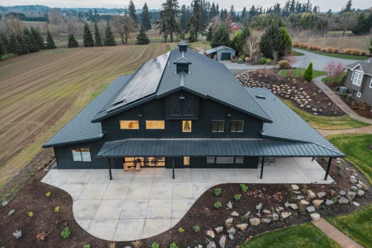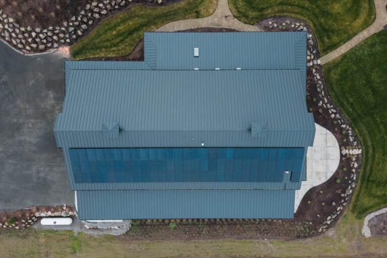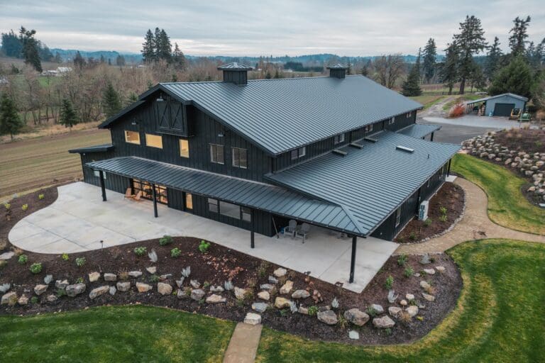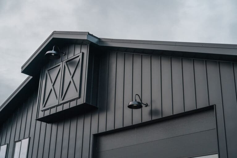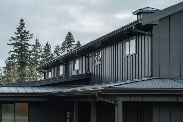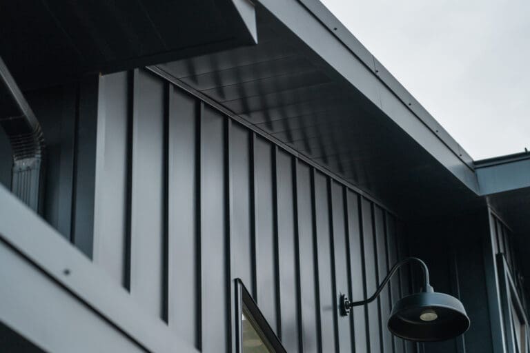 This residence features three of Taylor Metal’s panels, which are Easy-Lock™, Lifetime Soffit™ and Board and Batten. Easy-Lock™ is a patented no-siphon dry lock standing seam panel that has a reversing feature that allows installation of panels from both directions. This panel is paired with our Board and Batten siding panel, which gives a beautiful classic look to any home. Lastly, our Lifetime Soffit™, which has the option of being produced with perforations, gives that nice overall finishing touch to complete this stunning home.