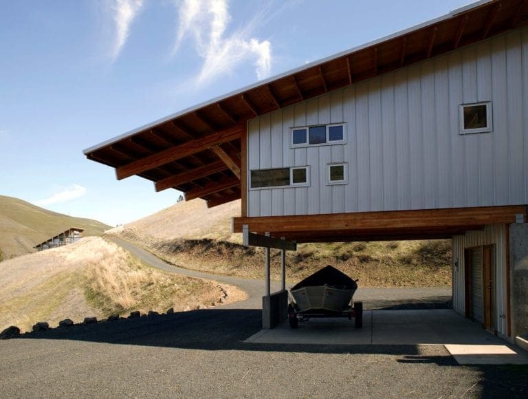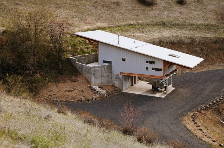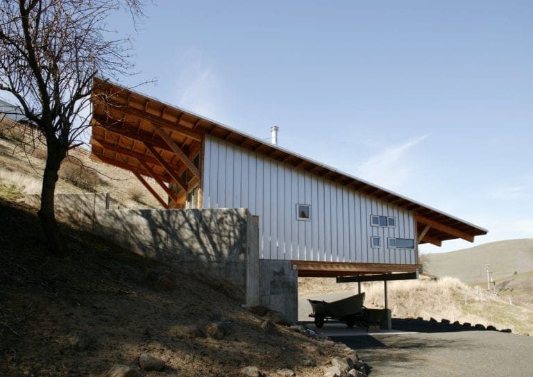 The Bunk House features Taylor Metal’s Easy-Lock™ Panel installed on its roof and siding. The panel profile style features three accent ribs, the gauge is 24, width is 12″ and the finish is Zincalume® Plus. The large overhangs provide cover for an uphill terrace and lower level parking area.