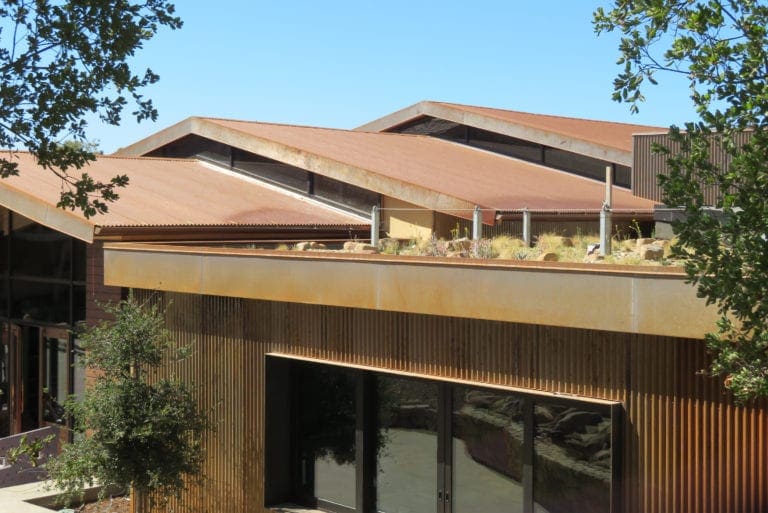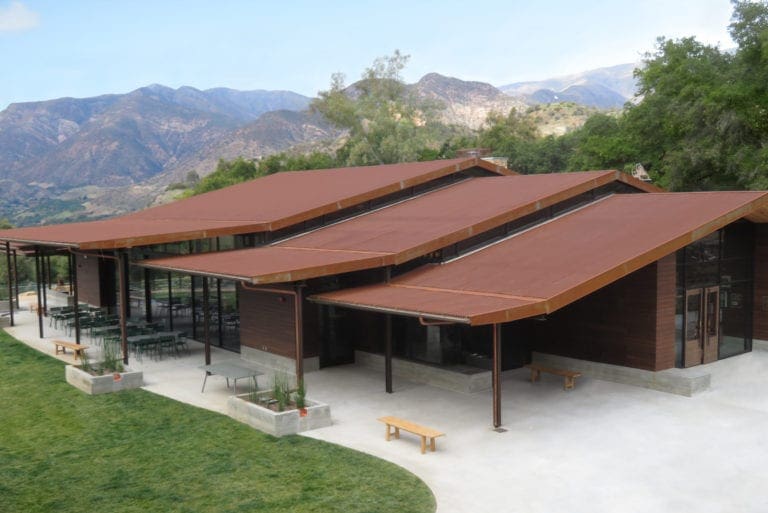 The Thacher School features Taylor Metal’s Classic 7/8″ Corrugated™ panel on the roof and accent walls; the width is 32″, the gauge is 22 with a Rusteel Plus™ finish. Rusteel Plus™ is an ideal design option for a classic, historic, and weathered look.